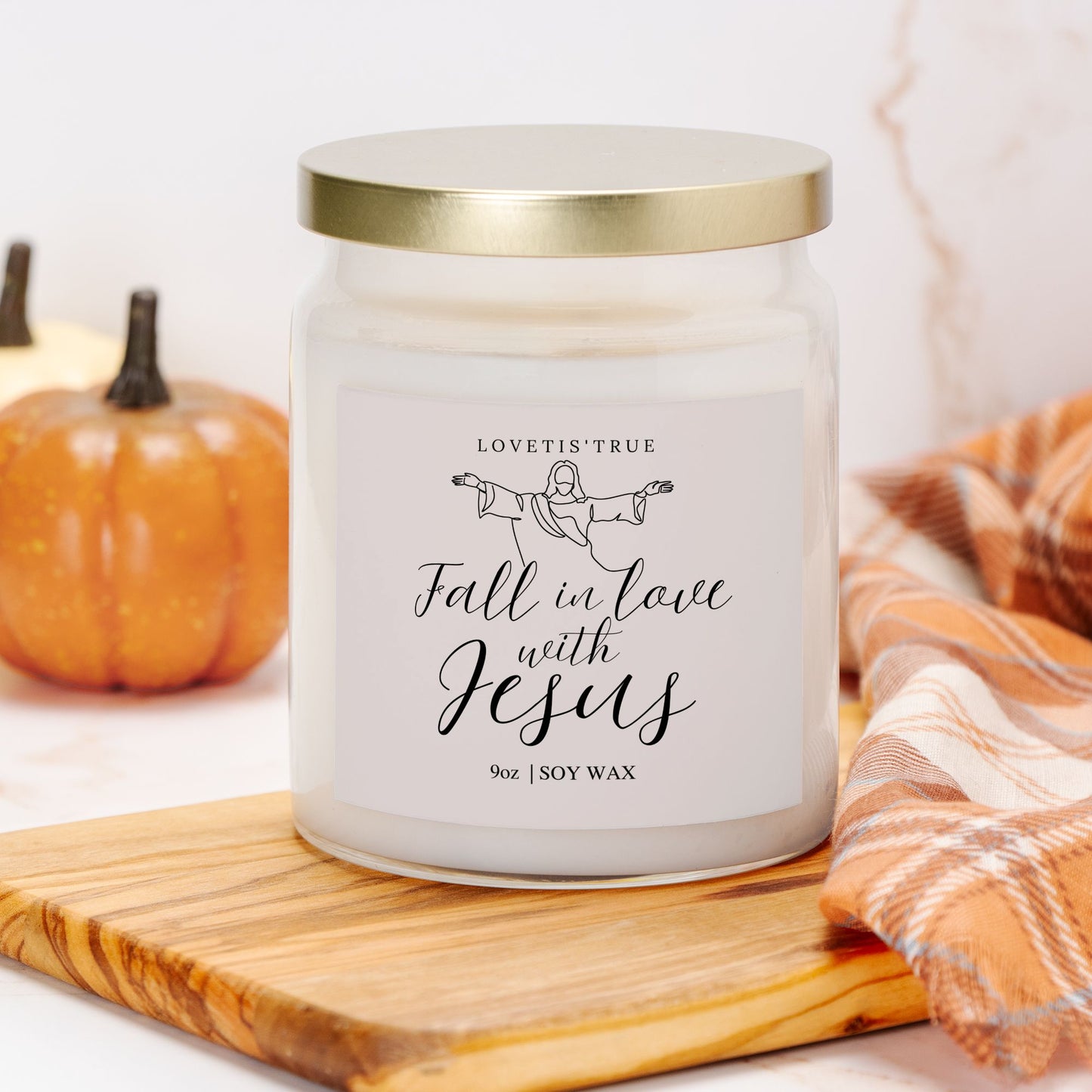 Cozy up this season with our beautifully crafted "Fall in Love with Jesus" candle, designed to fill your home with warmth and faith. Encased in a clear glass jar with an elegant gold lid, this candle is a reminder to embrace God’s love in every season.