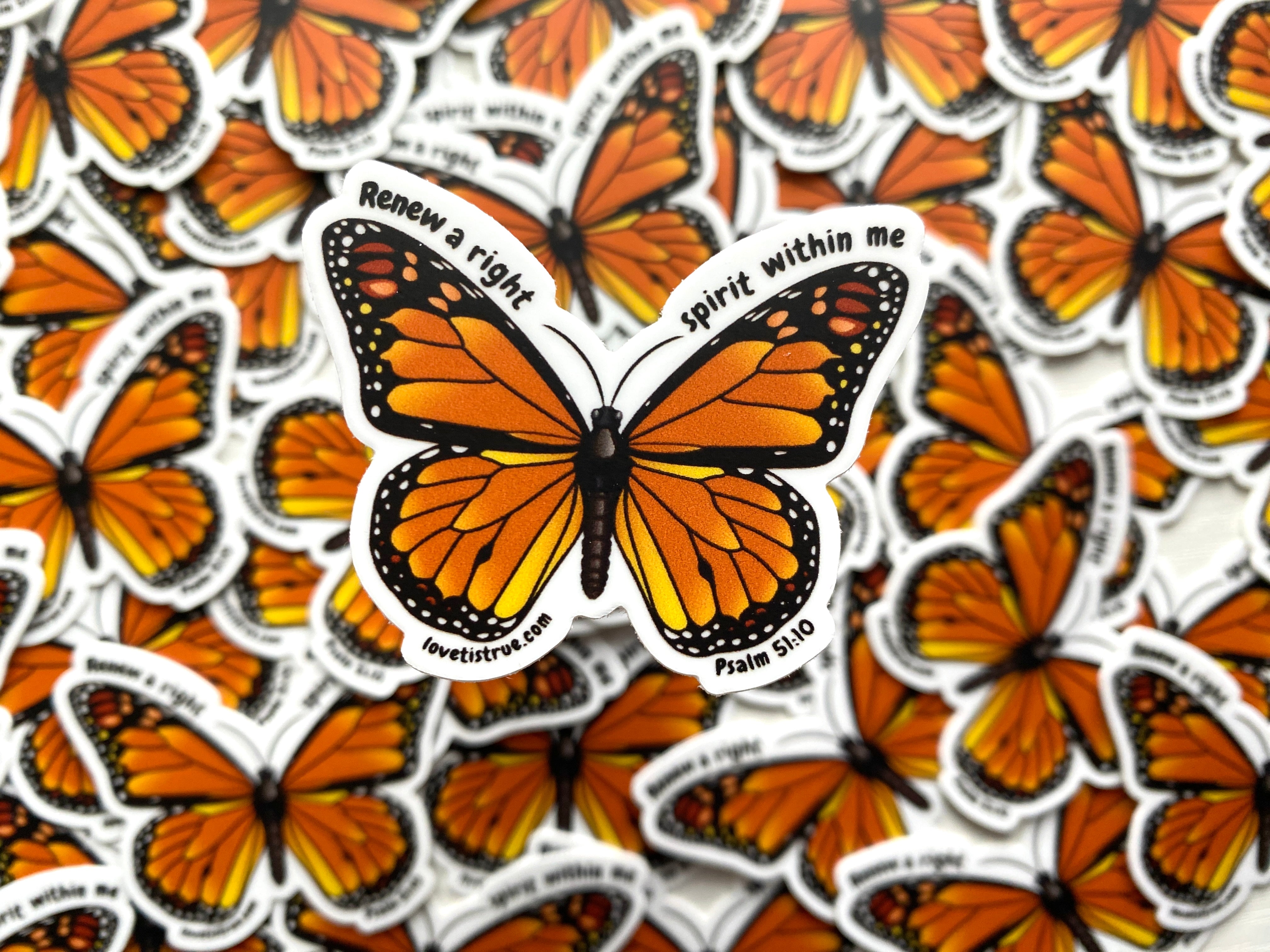 Inspired by Psalm 51:10, this beautifully crafted vinyl sticker features a monarch butterfly, symbolizing transformation, renewal, and a life surrendered to God. Just as a caterpillar undergoes a complete metamorphosis—emerging from its cocoon as a stunning butterfly—so too are we made new when we surrender to Christ.